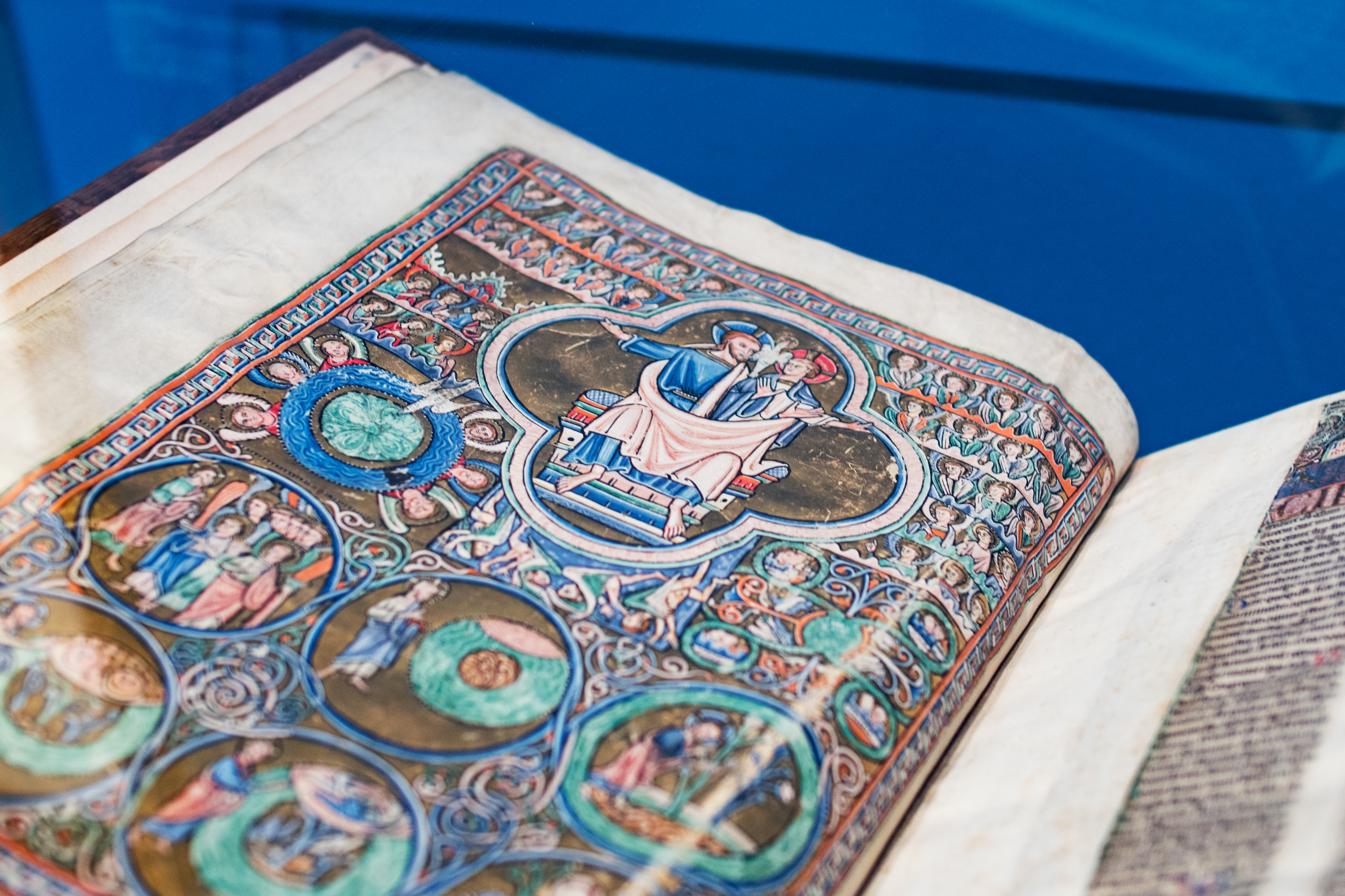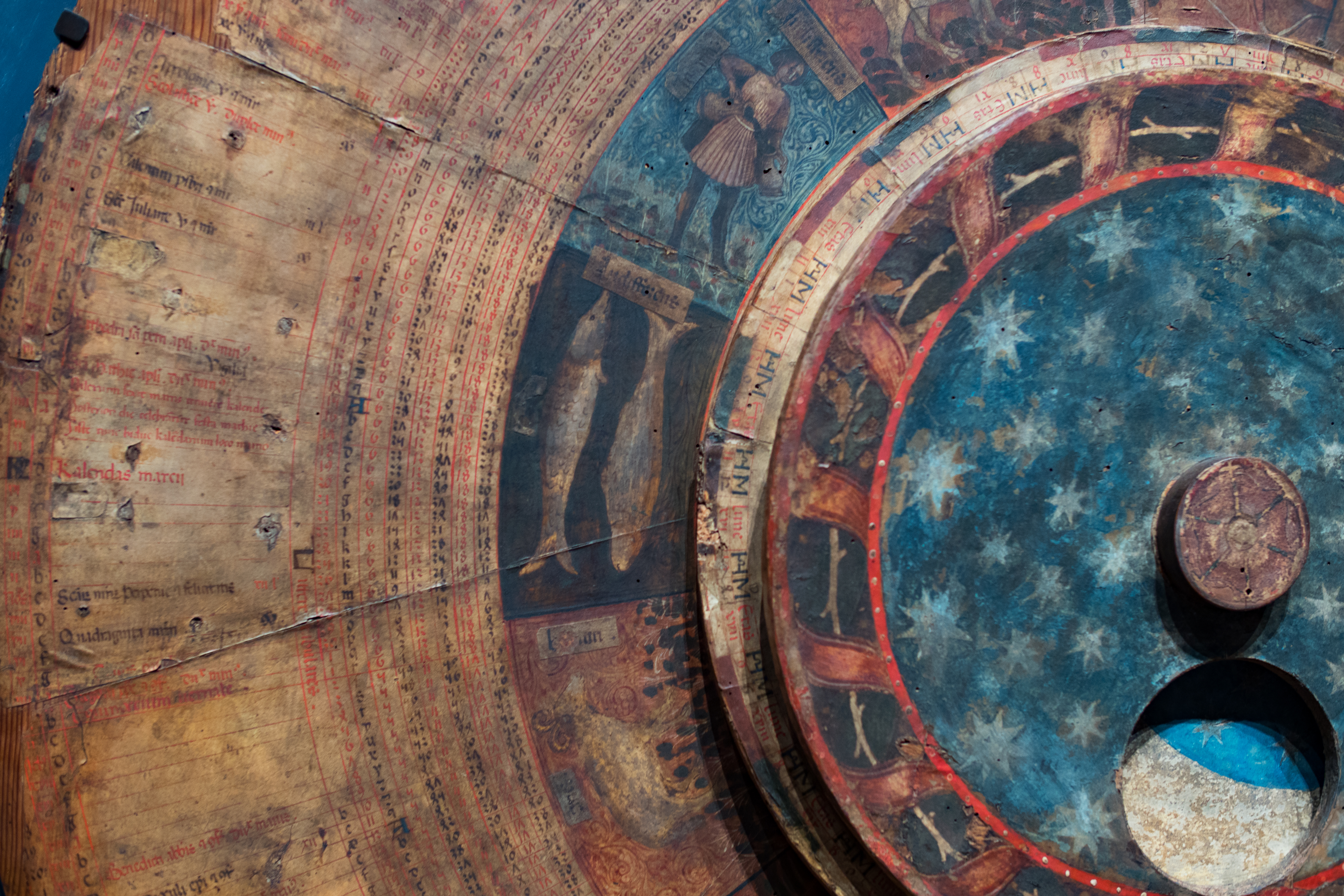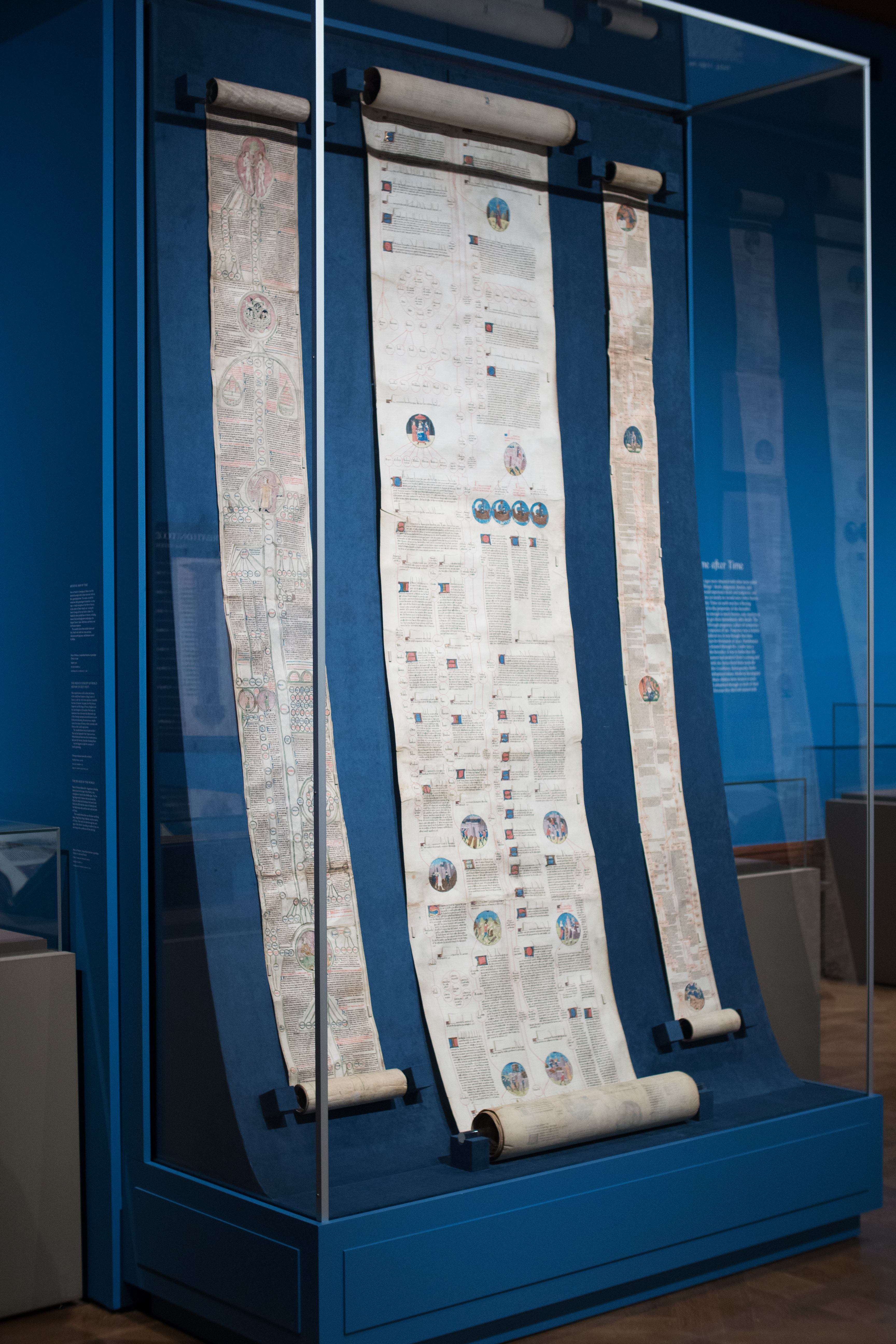 Two of the most fascinating objects in the exhibition reflect both the cycles of time that governed medieval life, as well as the medieval Christian perspective on history and eternity. The first of these is a remarkable astrolabe – the Astrolabe Of San Zeno, which was installed at the Benedictine monastery of the same name in Verona, Italy, in 1455. It's four feet in diameter, and each disk is covered with decorated vellum. The disks were rotated daily, by hand, and essentially it functioned as a rudimentary programmable calendar, able to display the Julian date, as well as feast days, the positions of the constellations of the zodiac, the amount of daylight for each day (which was essential for determining when prayers should take place) and even the phases of the moon.
