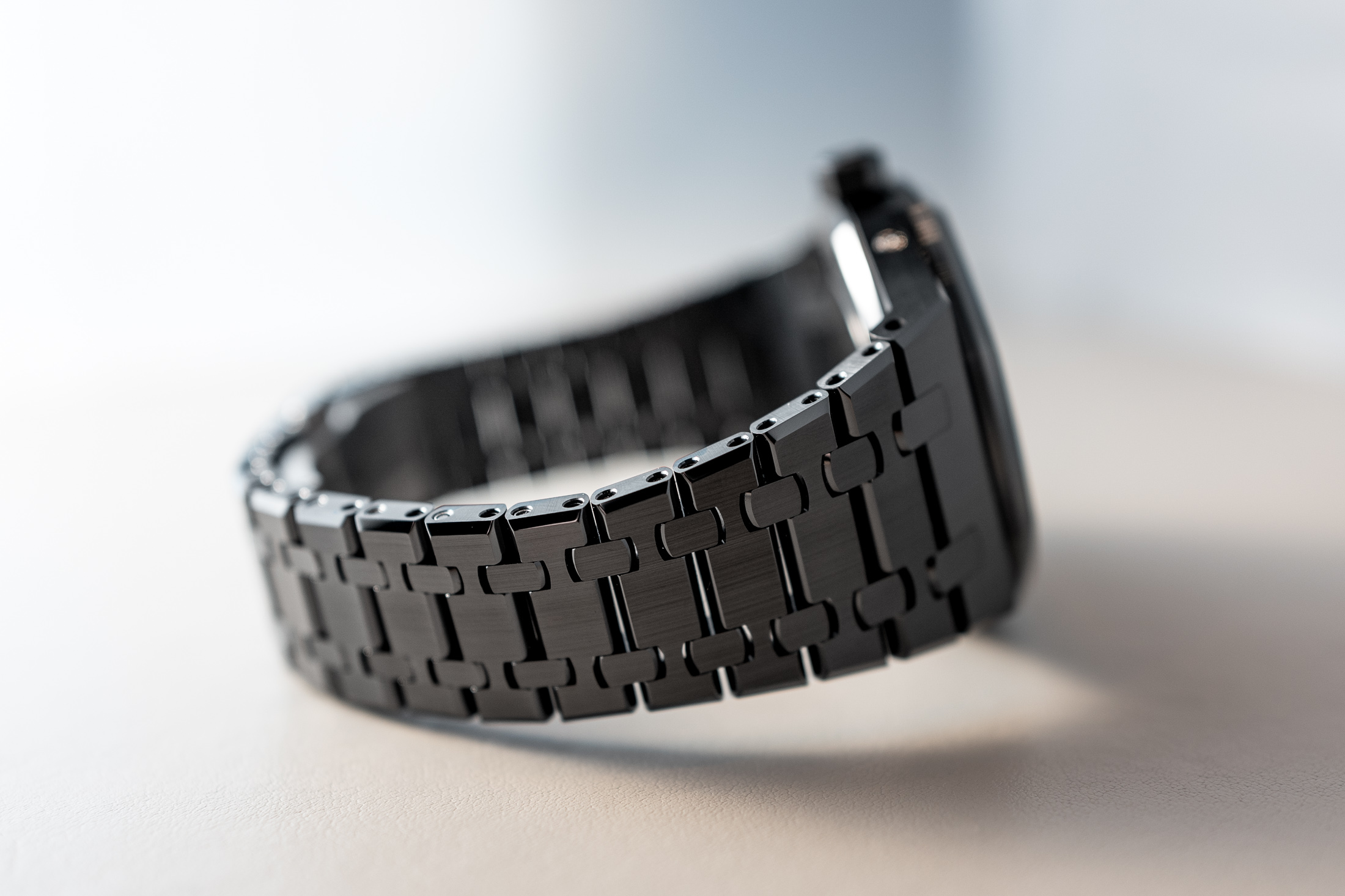 Brushed and polished to a level befitting any of its siblings, this Royal Oak ceramic case and bracelet vacillate between mirror black and a sort of dark grey with very pronounced finishing. In a dark space, like that of a back room in Audemars Piguet's Manhattan boutique, any such ceramic Royal Oak looks very smooth and very very black, with an endless array of faceted surfaces that catch any available light like a stealth plane that someone has polished, for whatever reason, to a mirror finish.