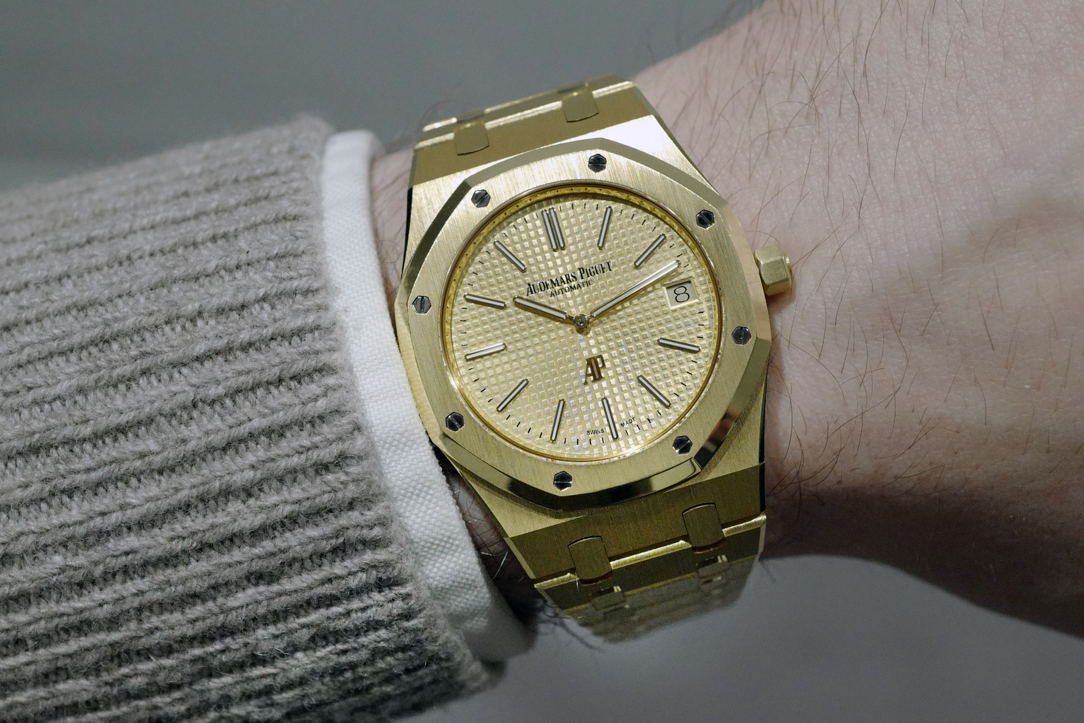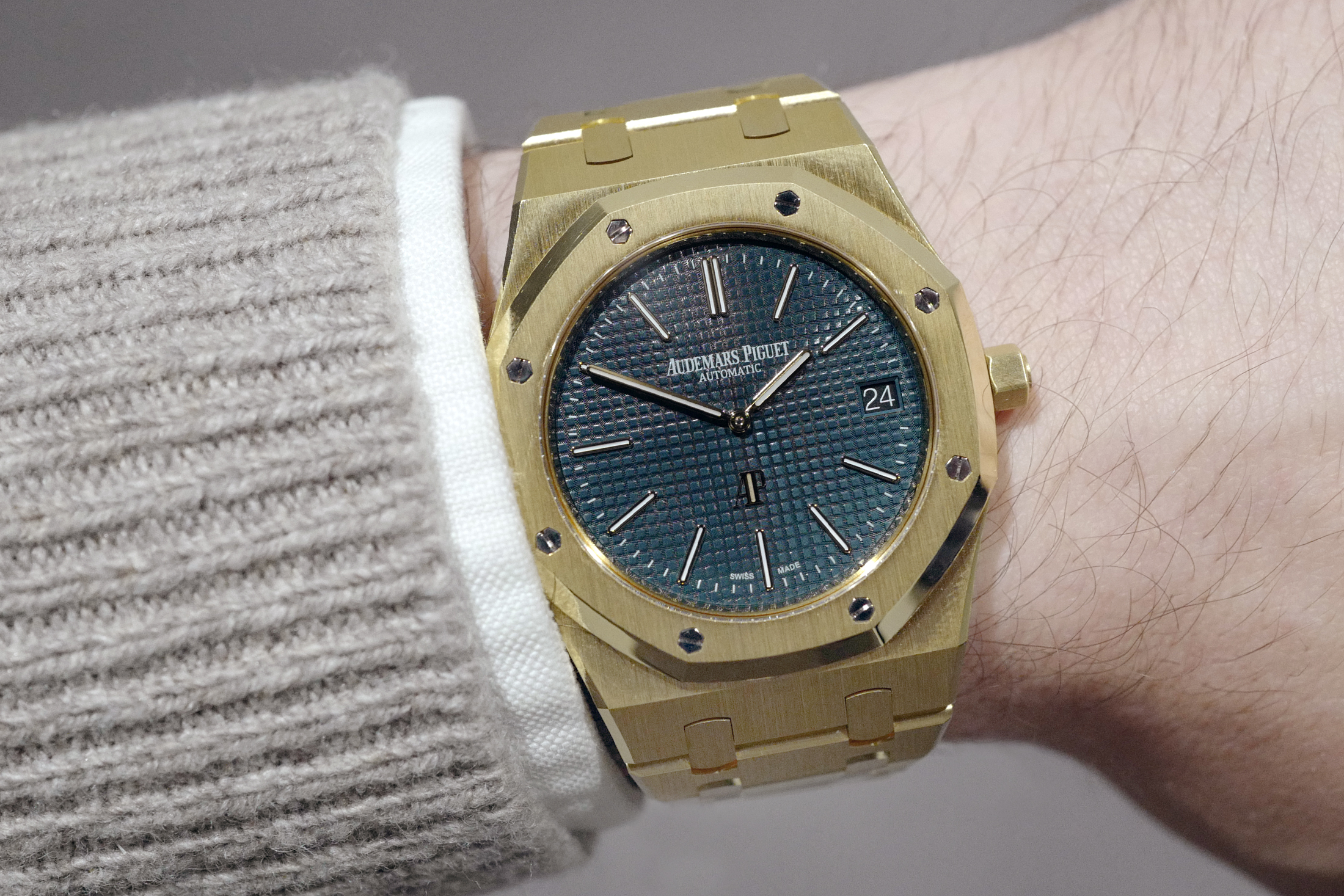 The Royal Oak "Jumbo" in yellow gold is not exactly a wristwatch you’d ordinarily think of as "everyday" in the usual sense of the word. For one thing, it’s a Royal Oak; for another thing, it’s a solid yellow gold Royal Oak, which is probably one of the most unapologetically yellow gold watches you can wear short of a Rolex Day-Date. In a funny way, this is why I think it’s the perfect everyday watch. Certainly, it’s a wearable size and certainly it’s going to be comfortable on just about any but the largest or smallest wrists, but what really makes it great for daily wear is that it brings a definite bit of attitude to the table, especially with the gold-colored dial – when it comes to gold, might as well go all in.