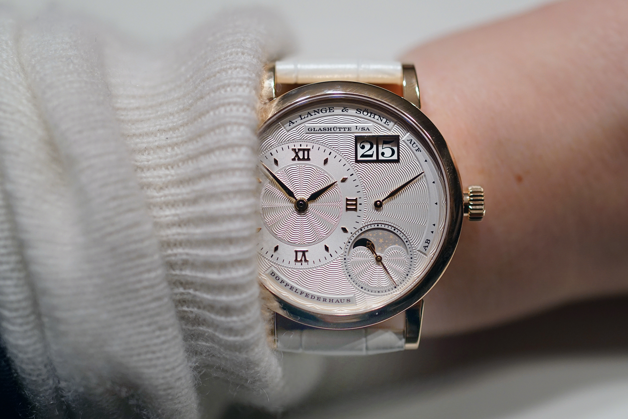 It is not a modest choice, but I really could see myself wearing the new A. Lange & Söhne 1815 Annual Calendar on a daily basis. It looks amazing on the wrist, with one of the most balanced dials you can find anywhere. I would not have expected to say that about a watch that went without the most distinctive of all Lange features, the split oversized date window, yet, there is no arguing that it looks much better without, even getting a bit of the golden Patek 3940 look with its stunning moonphase. This 1815 offers what Lange does best: a sumptuously finished manual-wound movement, a simple but beautiful 40mm case, and a single pusher on the right side reminiscent of the very first Saxonia released in 1994.