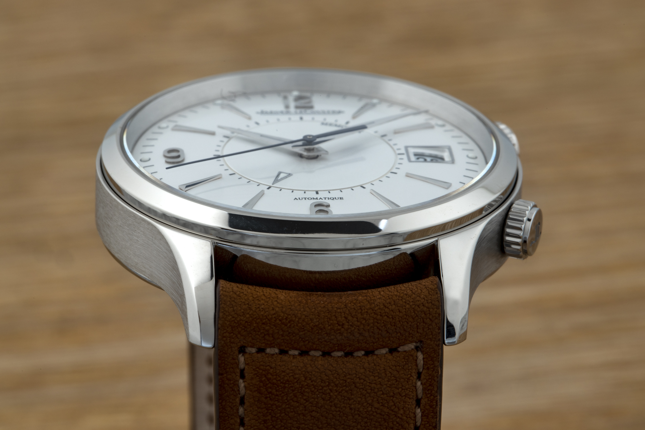 The standard, non-limited Master Control Memovox without timer that we see here has a comparatively austere silver dial with applied numerals, luminous markers, and a framed date window at 3 o'clock. The dauphine hands for the hour and minutes have a narrow cut-out with an application of Super-LumiNova. It's hardly the kind of application of luminous material that one might expect of, say, a sport watch, but the lume is nonetheless appreciated. The Memovox's central feature is, after all, an alarm; and this is a watch that one would likely keep on the nightstand and rely on to be woken up. This watch's sole touch of color comes from its blued steel seconds hand. The dial has balanced proportions, a clean design, and scores well in my book for legibility. Few areas of watch design inflame opposing passions quite like the date window, and this watch of course has a quite prominent one. It's even framed, drawing greater attention to it. This is something I generally applaud as an act leaning in. If you're going to have a date window, I've come to realize, there's no need to hide it.