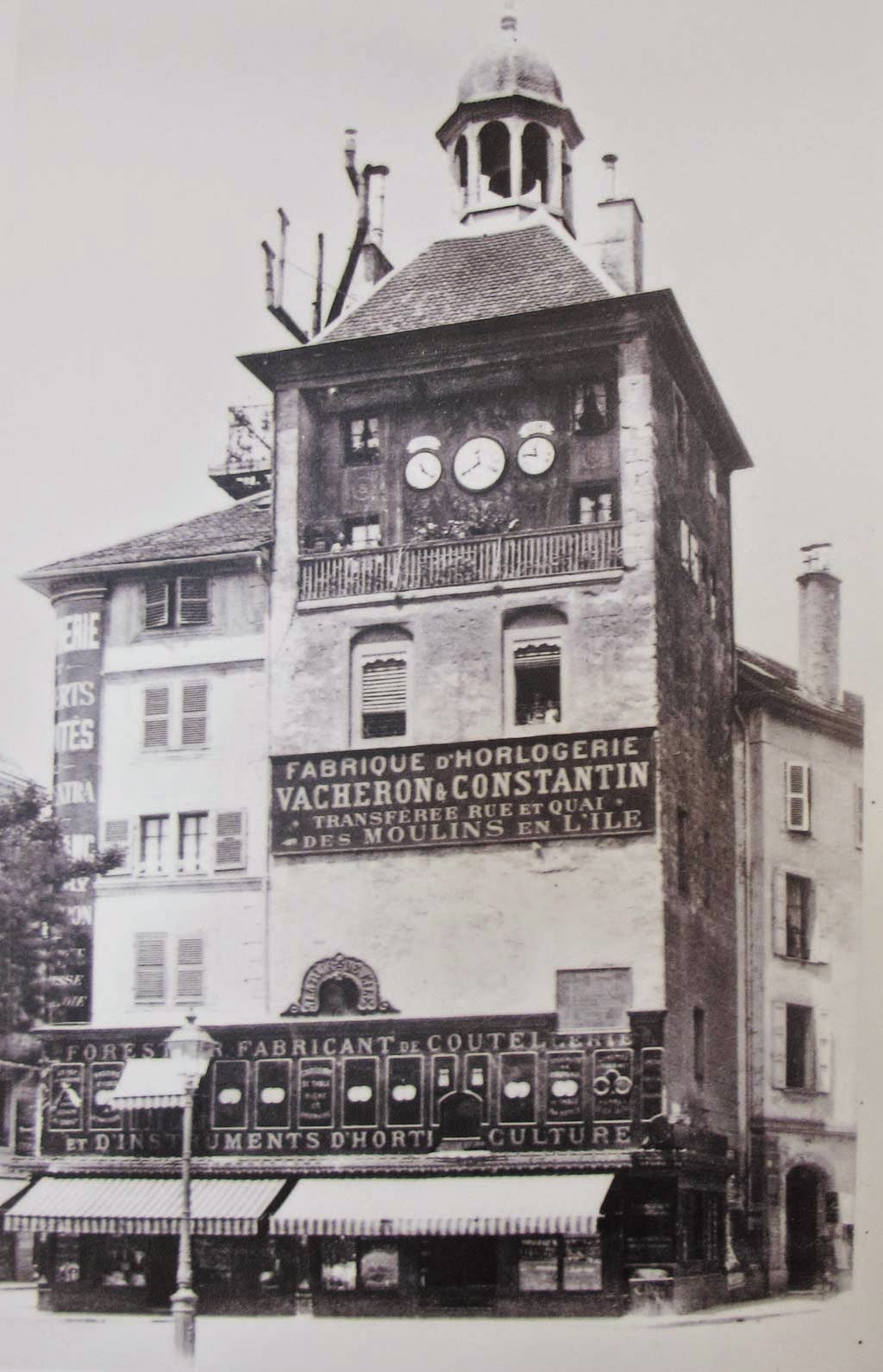 This image is of the clock as it appeared after being modified in 1858 to show local time in Geneva, Paris, and Berne; this was done for several reason. The first was that Paris time was the time standard used by the Paris-Lyons-Mediterranean railway company, which managed the Geneva-Lyon railway line. Bern time was necessary for telegraph and telegram communications, and was also the time standard for Swiss railway lines other than the P-L-M. The large central clock received an electrical time signal from the observatory at Geneva, starting in 1852. The clock is shown here as it was after 1875 (when Vacheron moved out of the tower to its manufacture in a building across the street) but before 1879, when the two smaller dials were removed. (The sign says that Vacheron Constantin has relocated to the corner of the Quai de L'ile and the Rue de Moulins.)