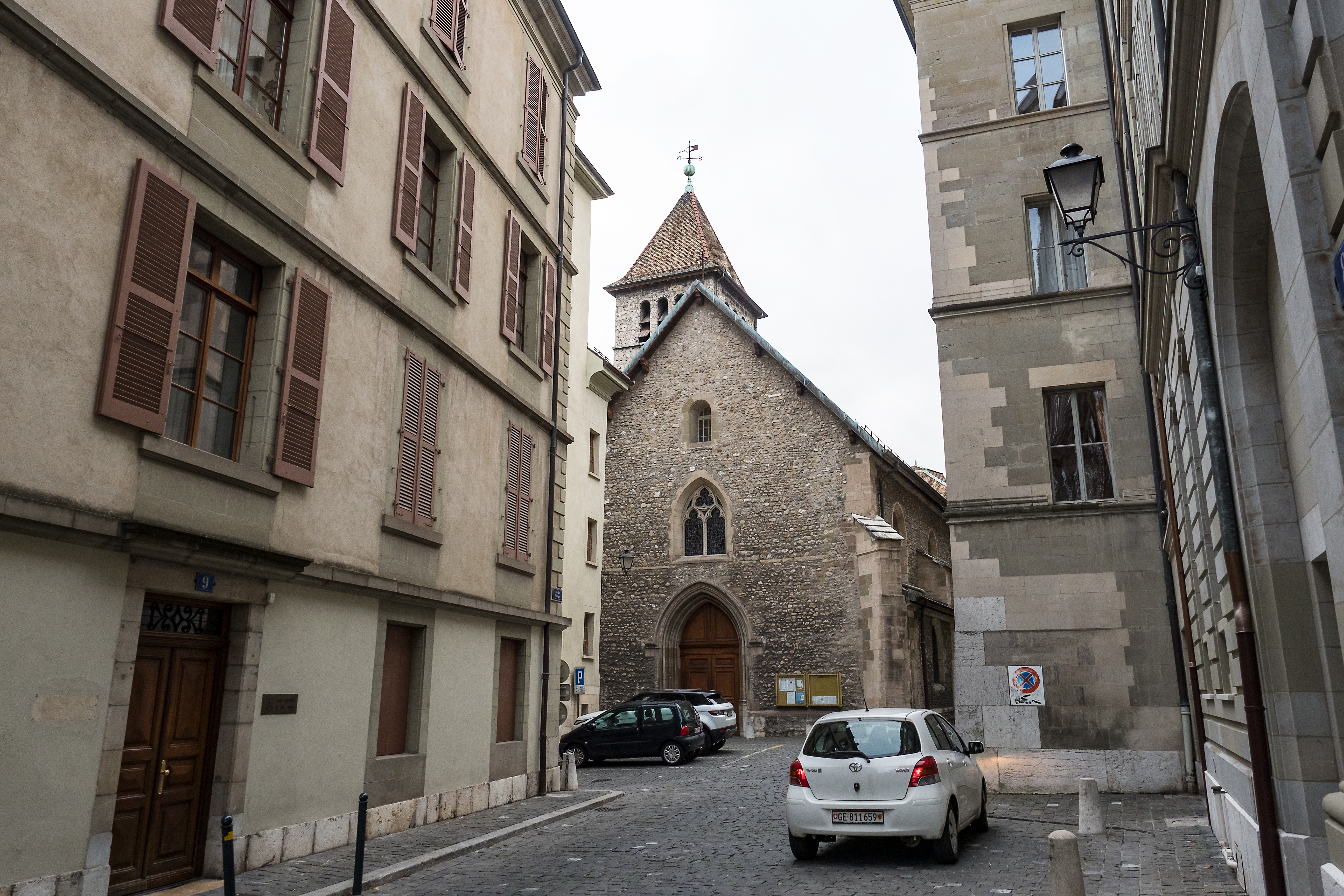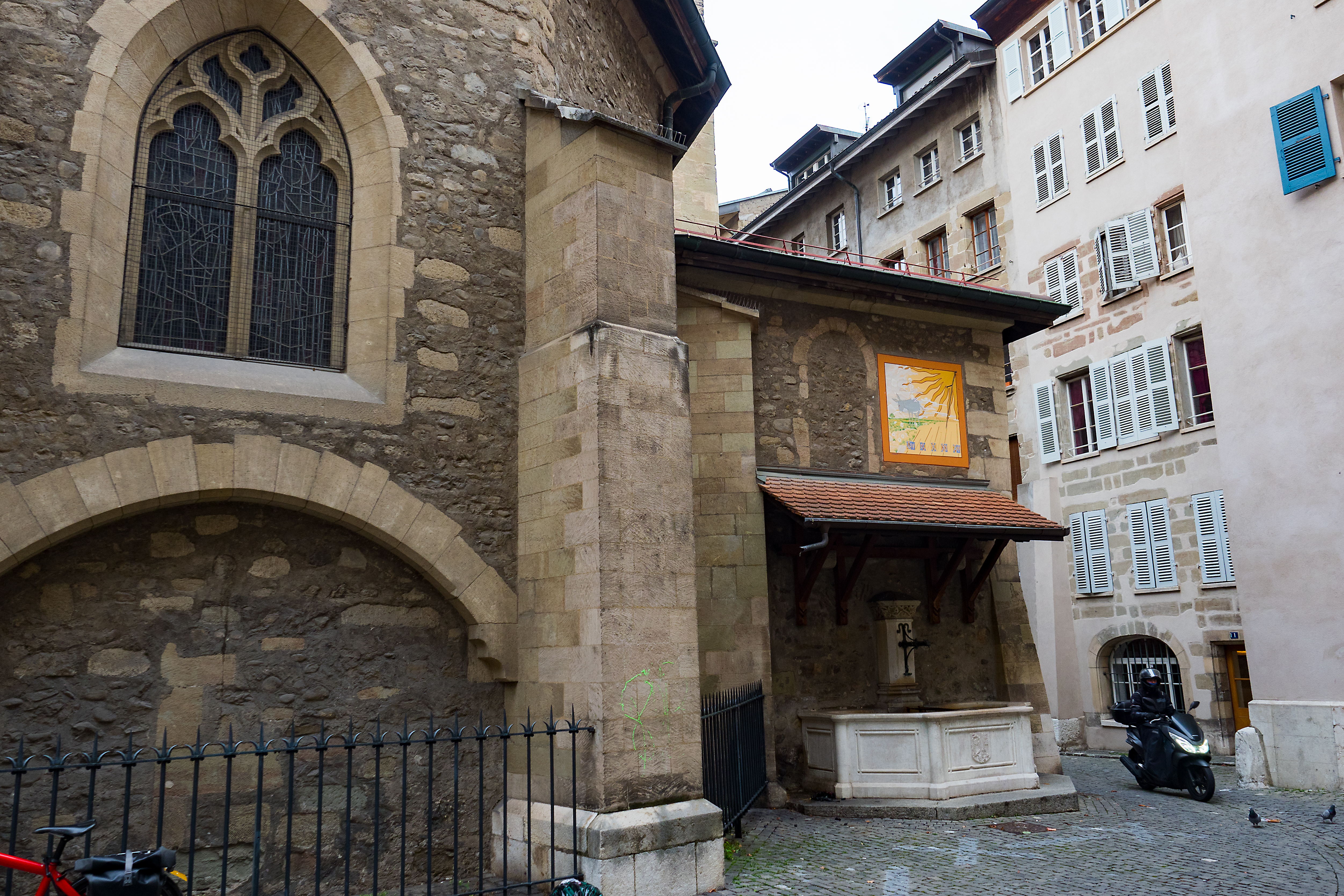Near the Cathedral of St. Pierre, there's a small but very old Gothic church, built in the 15th century (there has been a church there since the 4th century, when an early Christian basilica was built there). This is Église Saint-Germain de Genève. The current Gothic building is a renovation of an earlier Romanesque church, which was badly damaged by fire in the 1500s. This is one of Geneva's oldest districts, with much of the architecture and arrangement of the streets dating back to the Middle Ages, and it feels it – there are all sorts of unexpected alleys and side-streets. On the back of the building, there's a sundial.