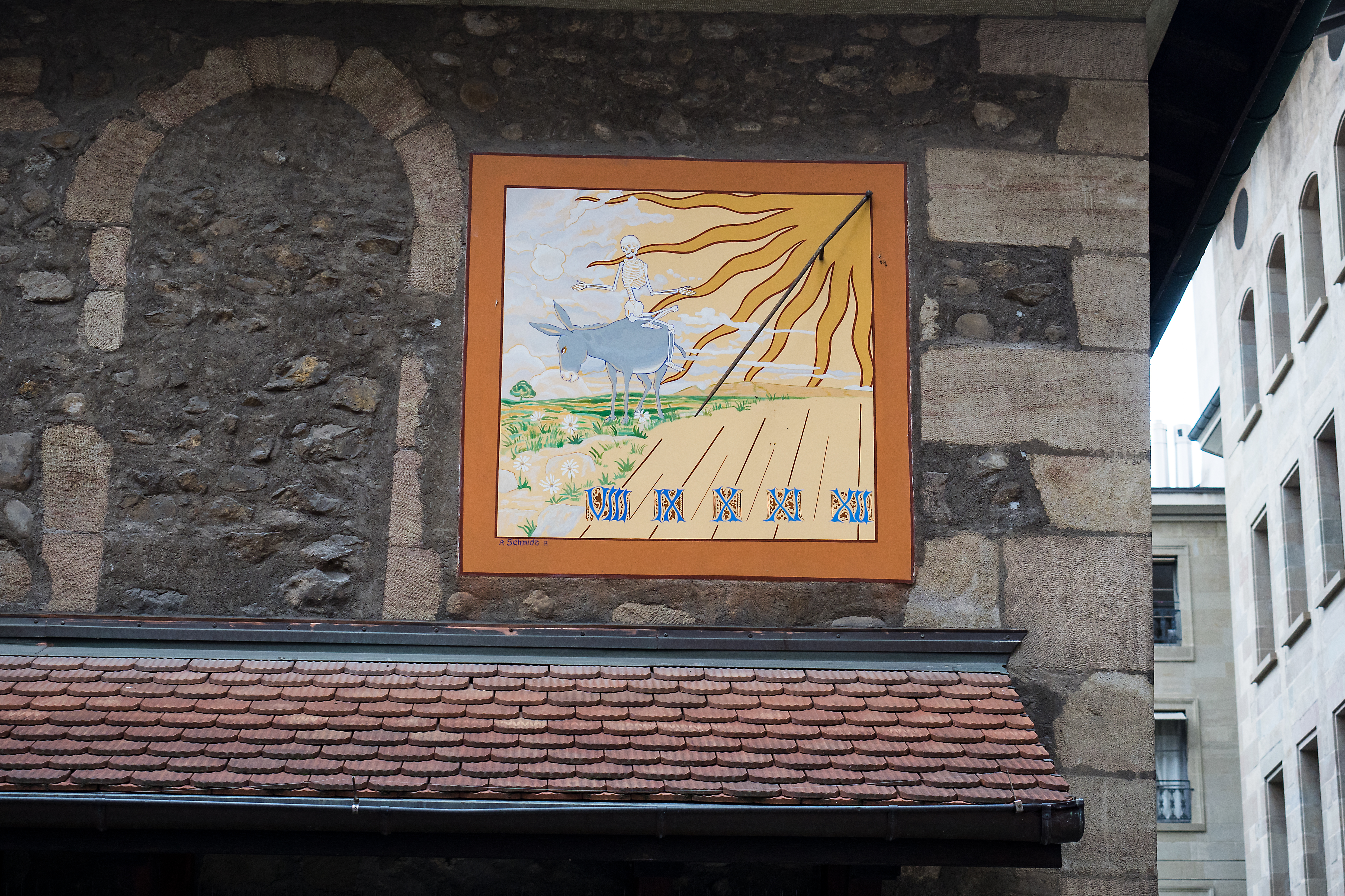 Even the fact that Geneva has a surprisingly large, thriving red light district (prostitution in Switzerland has been legal since 1942, and generates CHF 3.5 billion annually, compared to CHF 19.4 billion in watch exports for 2016) seems only to further underscore the degree to which Geneva gives the impression of being a town where punctuality is prized, profit is revered, and discretion is appreciated. (I discovered the existence of the red light district by accident, on my first visit to Geneva, when, after following as I thought, to the letter, instructions from a friend to a falafel stand called Parfum de Beyrouth, I found myself instead in front of a block-long storefront with a large red neon sign that said, somewhat unimaginatively but with indisputable clarity, "Sex Shop.") After all this is a city where a pressure relief valve for a hydroelectric plant is a major landmark and source of civic pride. However, it's not without certain austere charms of its own, as well as a good deal of historic interest, including a number of public clocks and sundials. One of the most important of these, as well as one of the oldest, is in the heart of the city itself.