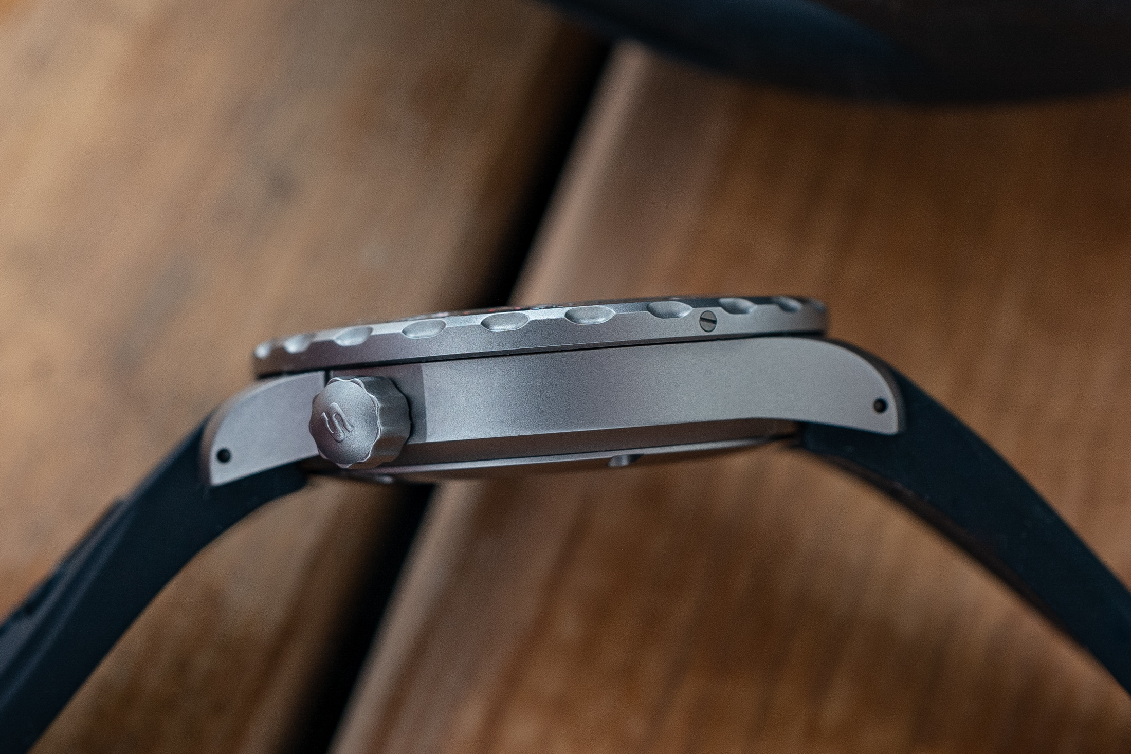 The crown is tucked away at 4 o'clock, which offers good on-wrist ergonomics but a somewhat compromised control setup. The crown is quite small, and I found it took some practice to get used to how much of a pinch it was for my fingertips. That said, the threading is positive (easy to align) and the general action is solid and nicely made.