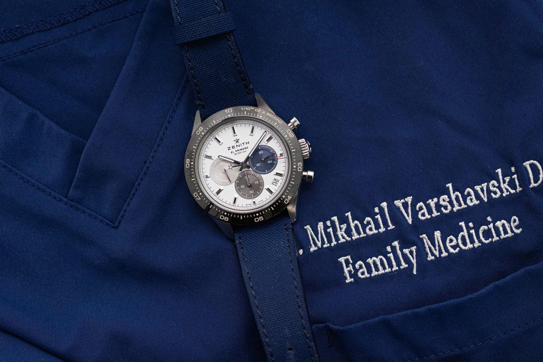 We've already hit on Zenith once here, so it's not hard to see why Doctor Mike loves the brand. With this Chonomaster Sport, he looks at it and remembers the connection to his father. He loves the clean design and the high-beat movement. Oh, and this is the work watch – the one he likes to wear in the hospital the most.