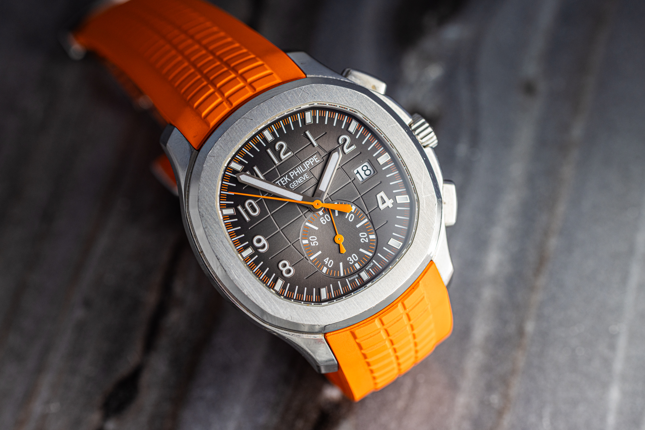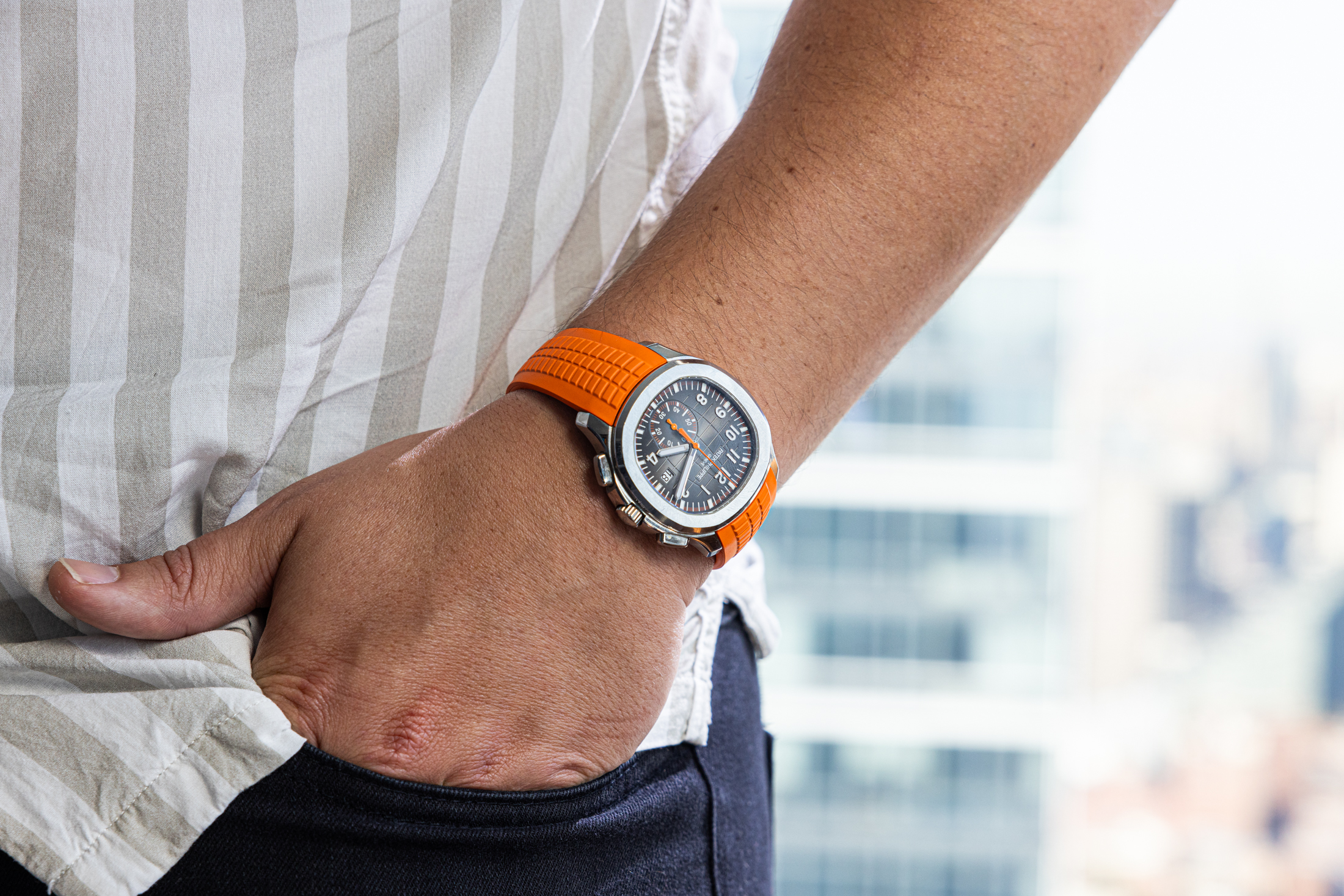 This is one heavyweight Aquanaut. It is the watch he wore after his first boxing win. He still has the video celebrating with his father afterward, which you can check out in the video above. And this orange strap wonder is important for another reason: he bought it to celebrate two billion (billion!) long-form views on YouTube.