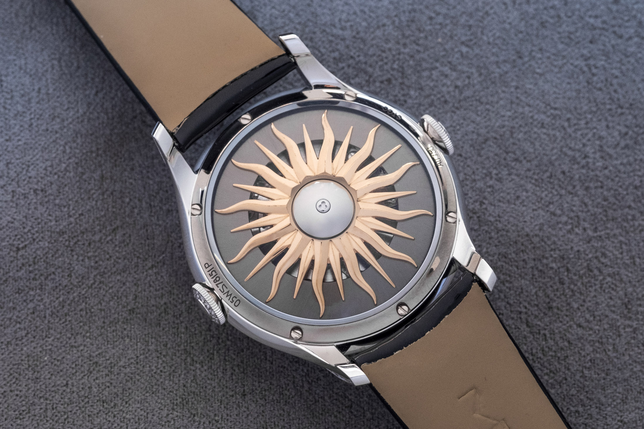 The sun-form rotor in red gold – one of the many thoughtful details of this watch.