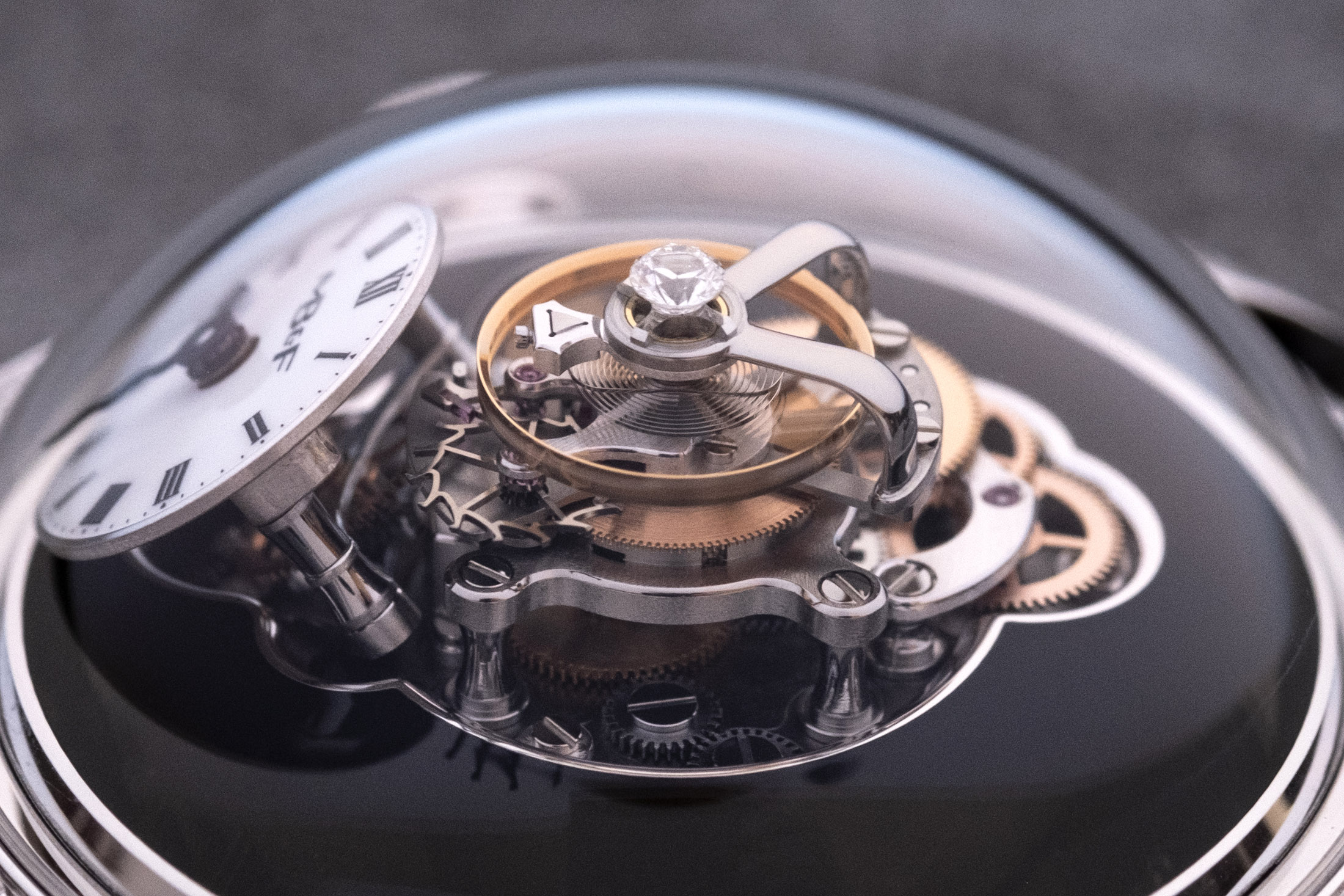 The watch itself comes in three variations that are all white gold and set with diamonds: one with a black lacquer dial plate; one with a dial plate and case fully set with brilliant-cut diamonds; and one with a dial plate and case both fully set with baguette-cut diamonds. The case measures 38.5mm and is 20mm thick (due to the domed crystal).