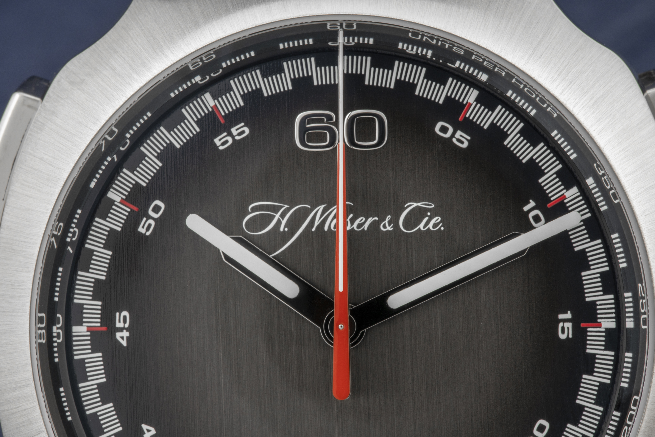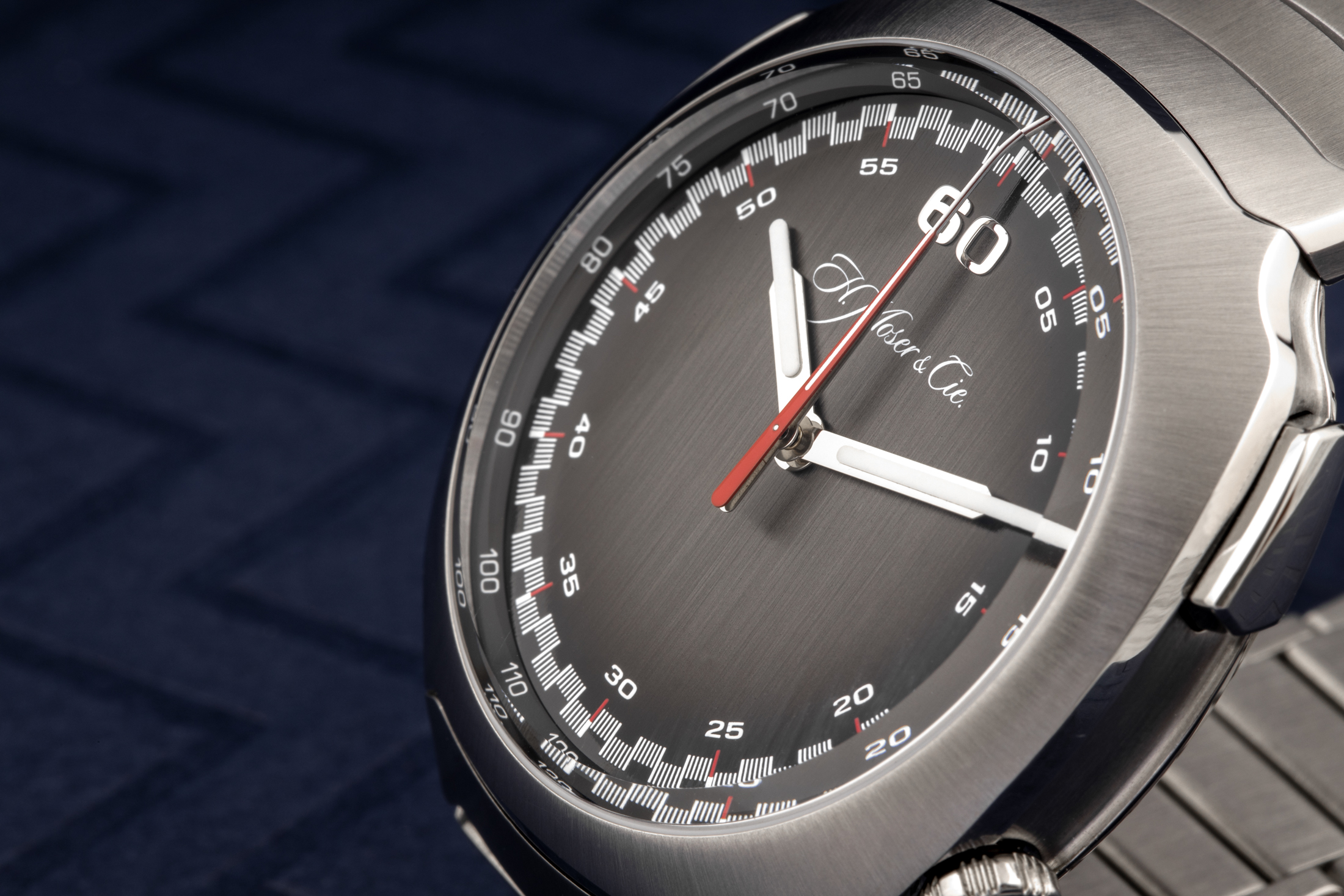 The dial and dial furniture are as well integrated to the overall design as the bracelet is to the case. Elements such as the rounded lume inserts on the hour and minute hands, as well as the very elegantly handled, curved taper of the two co-axially mounted chronograph seconds hands, show Moser's commitment to keeping the design language consistent through every element of the watch. In the sample we had for this review, the two chronograph seconds hands are as exactly superimposed over each other, as the most exacting watch enthusiast could expect from a high-end rattrapante chronograph, though this is a flyback, rather than a split seconds chronograph. There is a tachymeter scale as well but it is placed on the rehaut, and its presence does little or nothing to detract from the clarity and legibility of the watch.