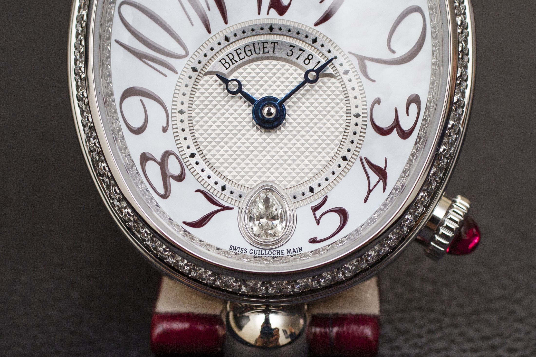 The 8918 released earlier this year is the same Reine de Naples that you are familiar with but with the addition of a few aesthetic changes. The watch maintains its elegance with its ovoid-form, egg-shaped case. This design stems from the original watch made by Abraham Louis Breguet back in 1812, and maintains its original appearance to this day. The updated 8918 has a white gold case with a two-sided bezel measuring 36.5mm x 28.45mm. On the surface of the bezel is a finely engraved Clous de Paris motif, and on the outside is a row of 117 brilliant cut white diamonds. In the world of diamond-setting, I would argue this is the most discreet way to bling out your watch because they are only visible from the side. The case is finished off with a cabochon ruby-set crown, which plays off the burgundy theme of this watch.